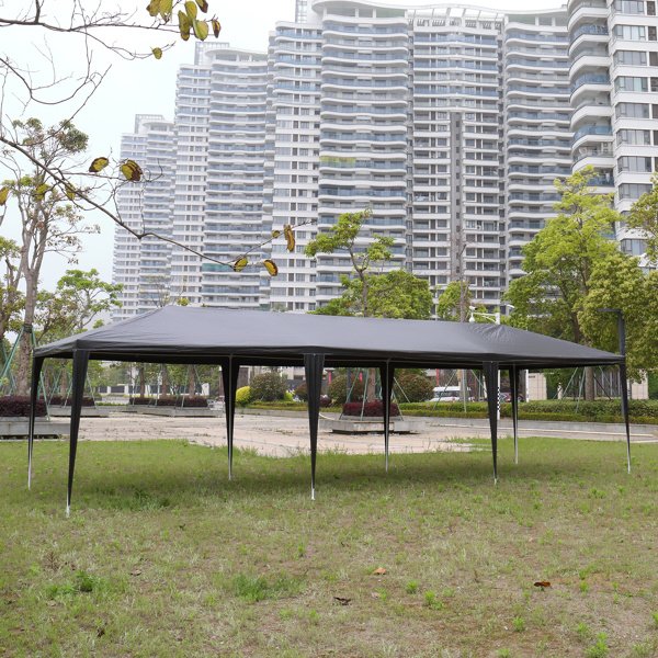 Introductions:Complete your party with this spacious and versatile Outdoor Party Tent! It is definitely a must-have for a party in your backyard or for a commercial event outdoors. Our outdoor party tent offers shelter from the sun rays and light rain, so as to provide the perfect space for serving food and drink. And the tent is a wonderful choice to add party atmosphere that will put all of your guests in the mood to celebrate. Removable sidewalls allow you to leave open sides as many as you want.Features:[Big and spacious]10'X30' (3m*9m) outdoor party tent can hold up to 50 people, making it a wonderful choice for a variety of outdoor events like party, wedding, graduation, flea market, small business, picnics, sporting events, arts and crafts tables and much more.[Removable sidewalls with windows]A total of 8 removable sidewalls can be set up any way you want. Each wall has a clear window to ensure maximum lighting in the tent.[Durable waterproof material]High quality PE cloth provides excellent shelter from the sun rays and light rain.[Upgraded pipe connection for better stability]Our tent uses threaded pipe connection to offer stronger support. Also come with ropes and ground stakes for keeping your tent firmly.[ATTENTION]Do not use the tent in windy or rainy days. Please use ropes and ground stakes to secure the tent.Specifications:1. Material: Iron Tube & PE Cloth2. Color: Black3. Dimensions: (30 x 10 x 8.5)" / (900 x 300 x 260)cm(L x W x H)4. Weight: 39.68lbs / 18 kg5. Waterproof: Yes6. Suitable for: Household, Wedding, Party, Parking Shed, etc.Package Includes:1 x Party TentNotice:Be sure to install the product according to the instructions