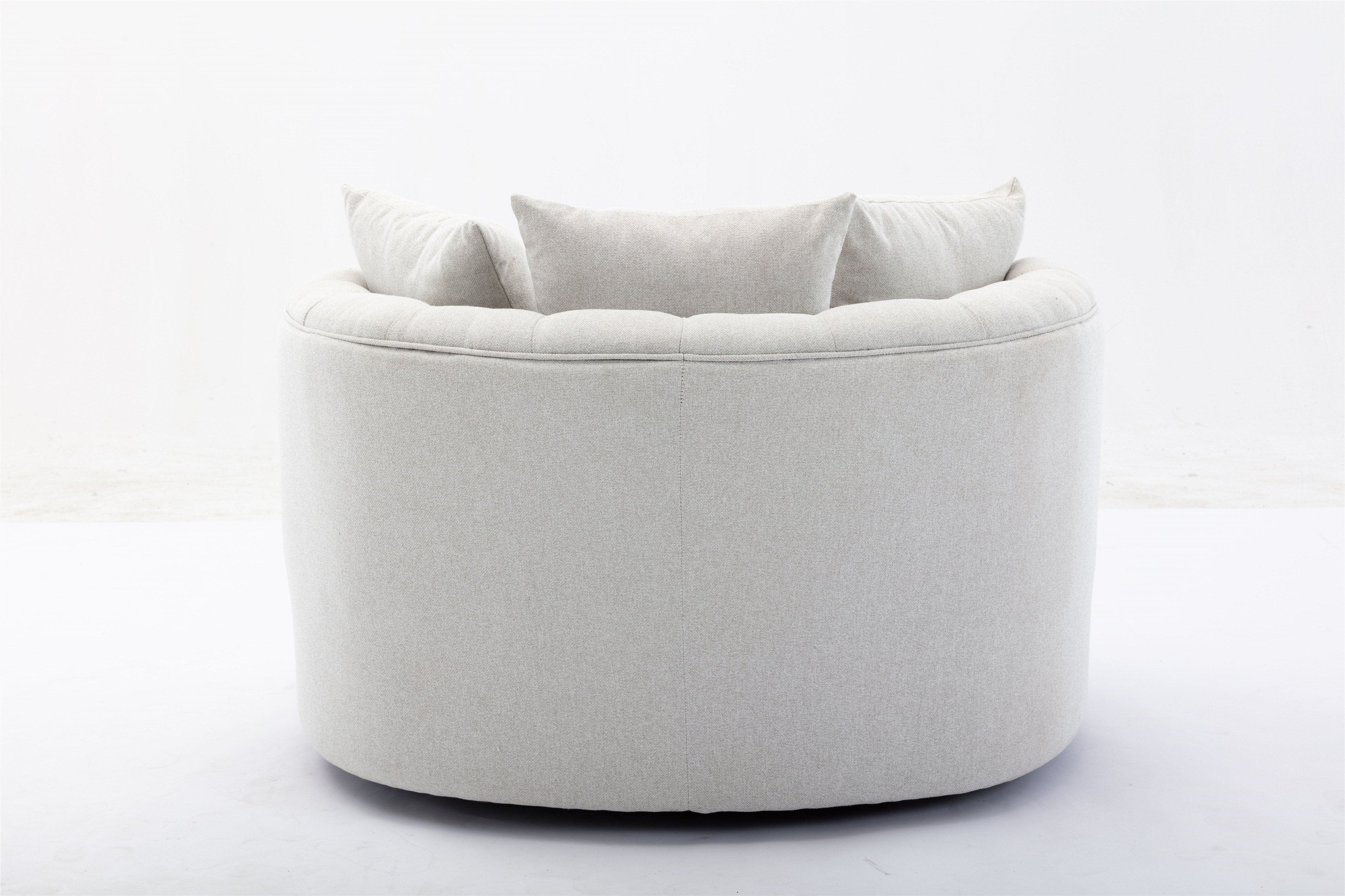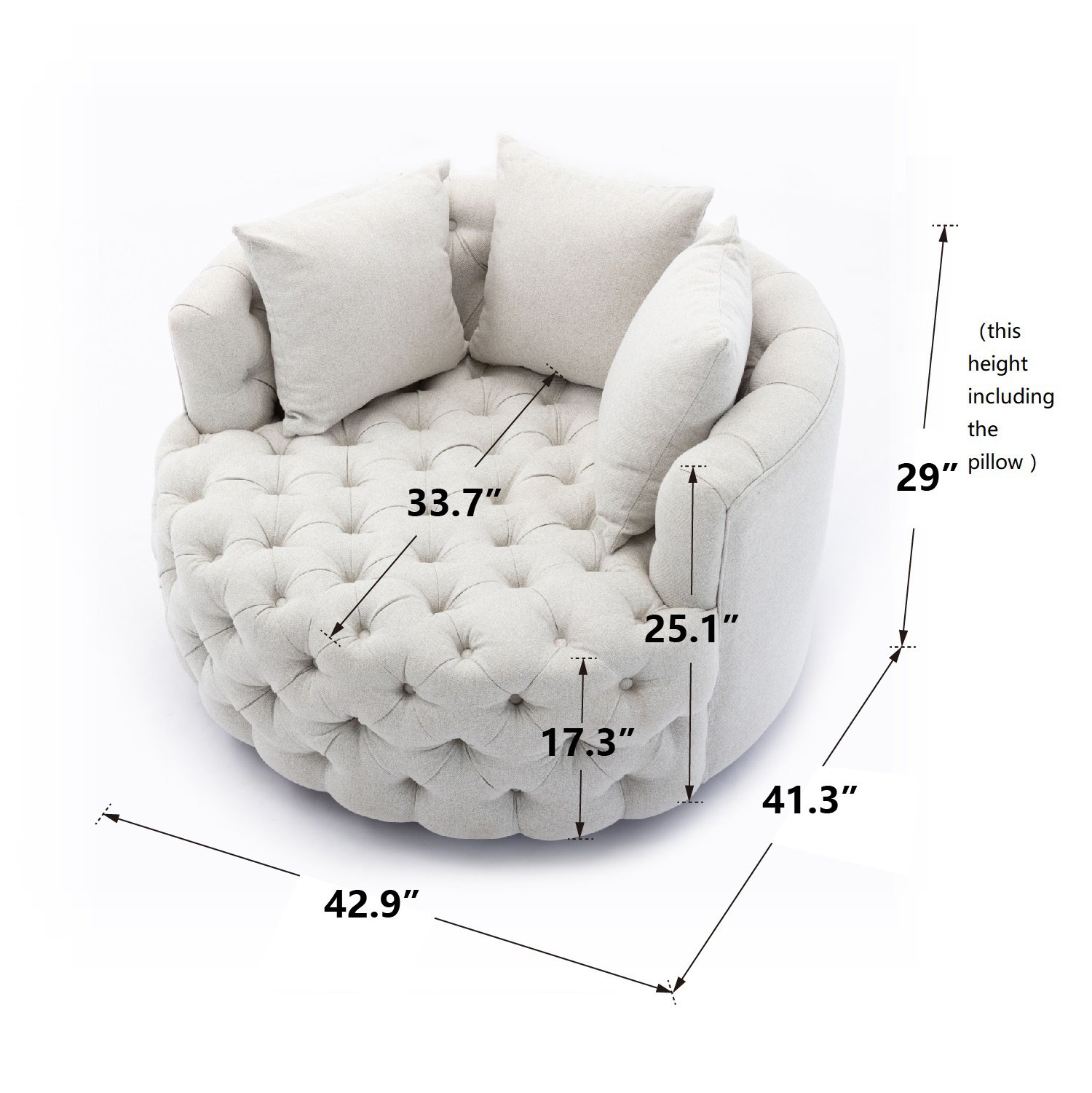 360° Swivel & Ergonomic Design it It boasts a barrel silhouette with a swiveling construction, offering convenience and mobility while you lounge. Besides, a soft padded seat and ergonomic curved back offer you more comfort, giving you a surprisingly good sitting experience.Weights & DimensionsUpholstery MateriallinenSeat Fill MaterialFoamBack Fill materialFoam with upholsteryWeight Capacity250 lbFrame MaterialplyoodArms IncludedYesLeg MaterialMetal baseCountry of OriginChinaProduct size42.91*41.34*25.59-28.74inchPacking size43.7*42.13*25.98 inchSeat Height17.32"Seat Width33.66"Seat Depth39.37"Net /Gross Weight71.63Lbs / 82.65LbsBack height8.67"