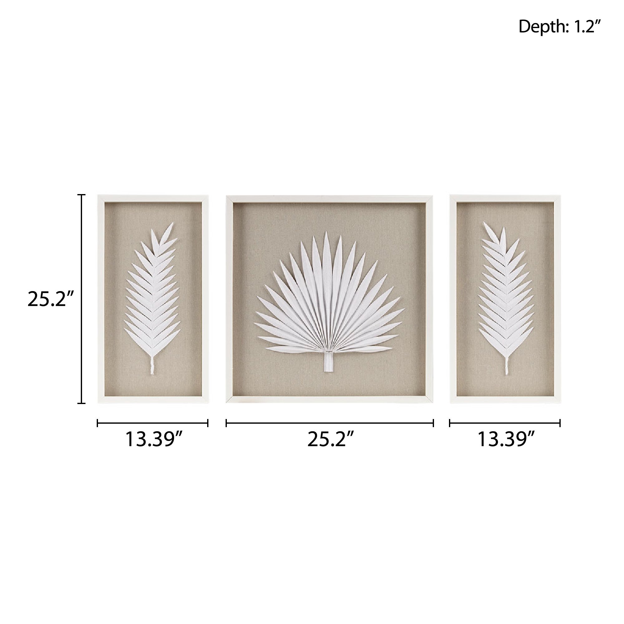 DESCRIPTIONRefresh your space with the coastal elegance of the Madison Park Sabal Framed Rice Paper Palm Leaves 3-piece Shadowbox Wall Decor Set. Each shadow box features a handmade, rice paper palm on a soft linen ground for a naturally modern and unique botanical design. Placed under glass and finished with a white frame for an elevated, gallery look and feel. 2 D-rings on the reverse of each piece makes this 3 Piece set easy to hang in any living room, entryway, or bedroom; Hang this set together for a large focus wall decor or hang pieces separately to fit any space and tie a room together. Spot clean only.PRODUCT DETAILSSee below1 Center Piece: 25.2"W x 25.2"H x 1.2"DCenter Piece Glass Size: 24"W x 24"H2 Side Pieces: 13.39"W x 25.2"H x 1.2"D (2)Side Piece Glass Size: 12"W x 24"HMATERIALPaper: 40% MDF: 20% Glass: 20% Polystyrene: 15% Linen: 5%