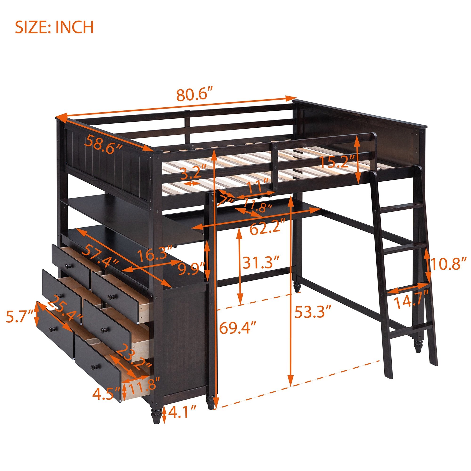 Full size Loft Bed with Drawers and Desk; Wooden Loft Bed with Shelves