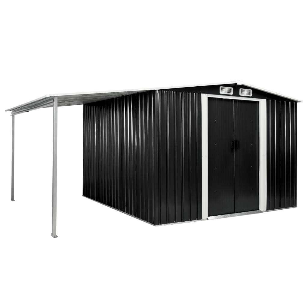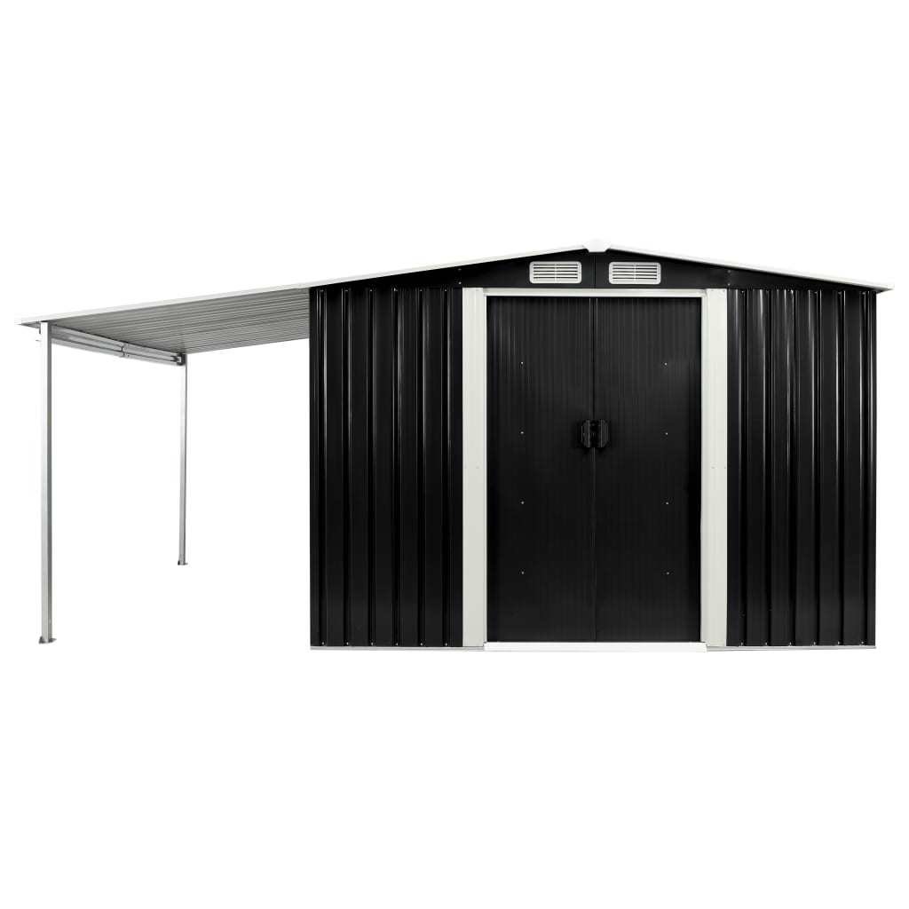 The outdoor storage house needs assembly.Color: AnthraciteMaterial: Galvanized steelOverall dimensions: 152" x 102" x 70.1" (W x D x H)Shed dimensions: 101.2" x 102" x 70.1" (W x D x H)With 4 ventilation shuttersWith sliding doorsExtended roof can be fixed on either side of the shed