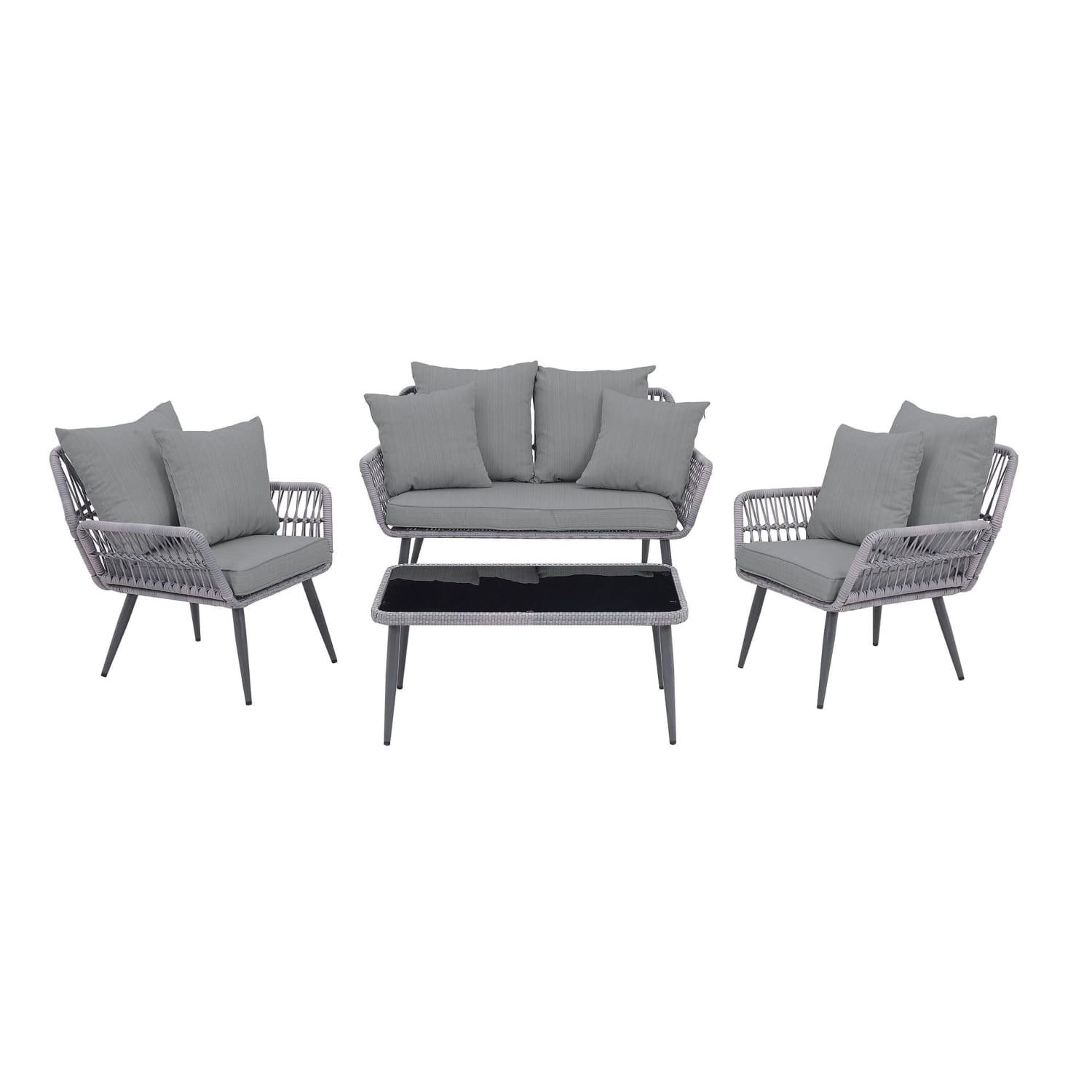 Manhattan Comfort Portofino Rope Wicker 4-Piece Patio Conversation Set with Cushions in Grey