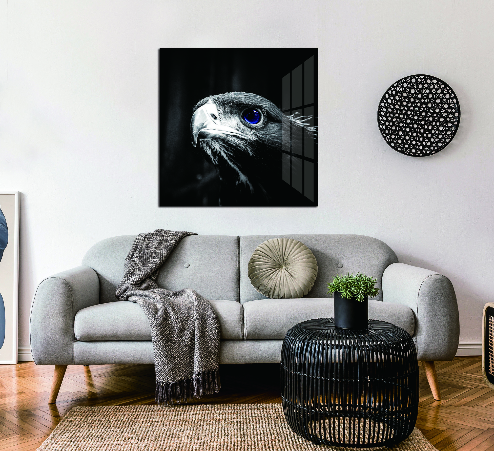 This contemporary acrylic wall art is designed for those looking to add a striking focal point to any living room, bedroom, or office. The image contains a focused blue eyed eagle. The 100% acrylic construction makes for a glossy finish, bringing the image to life in any setting and with any amount of light. Featuring a square orientation, this wall art measures 40 In. H x 40 In. W. Ready to hang hardware included. To clean and maintain acrylic wall art, wipe with damp cloth or non-abrasive cleaner. One Year Limited Manufacturer Warranty.