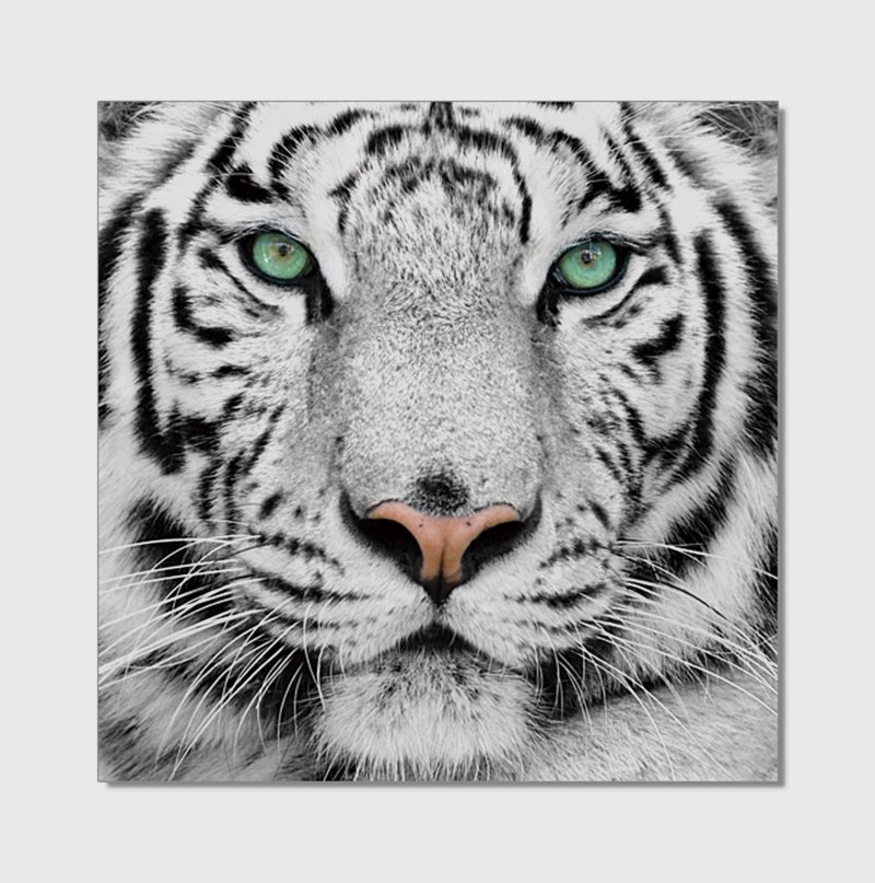 Capturing the strength and beauty of its subject, this contemporary acrylic wall art from Oppidan Home is designed for those looking to add a striking focal point to any living room, bedroom, or office. The image features a close-up shot of what could be interpreted to be a snow tiger or a black and white image of a bengal tiger. The dark background contrasts with the white fur and black stripes of the tiger, focusing the viewer's attention on the grace and strength of its subject. The 100% acrylic construction makes for a glossy finish, bringing the image to life in any setting and with any amount of light. Ready to hang and featuring a square shape, the wall art measures 40 inches long and 40 inches wide. To clean and maintain acrylic wall art, wipe with damp cloth or non-abrasive cleaner. Easy to hang hardware included. One Year Limited Manufacturer Warranty.