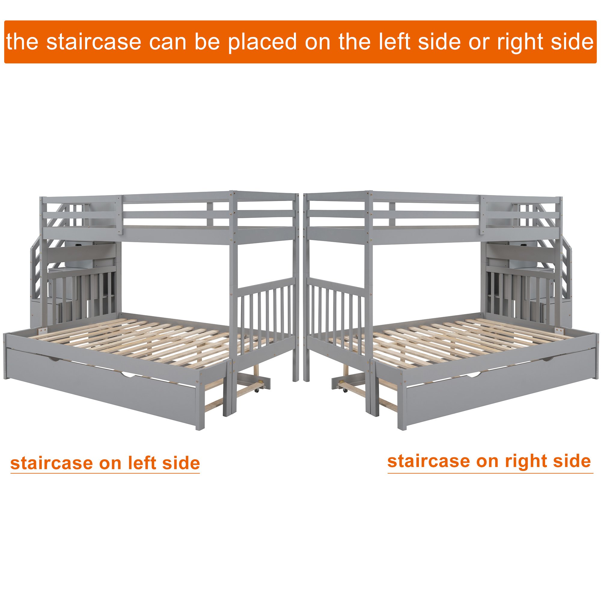 2.This bunk bed can be contracted into a twin over twin bunk bed with a twin size trundle or expanded into a twin over full bunk bed with a twin size trundle to accommodate your family or any overnight sleepers.The staircase can be placed on the left side or right side. No spring box needed.