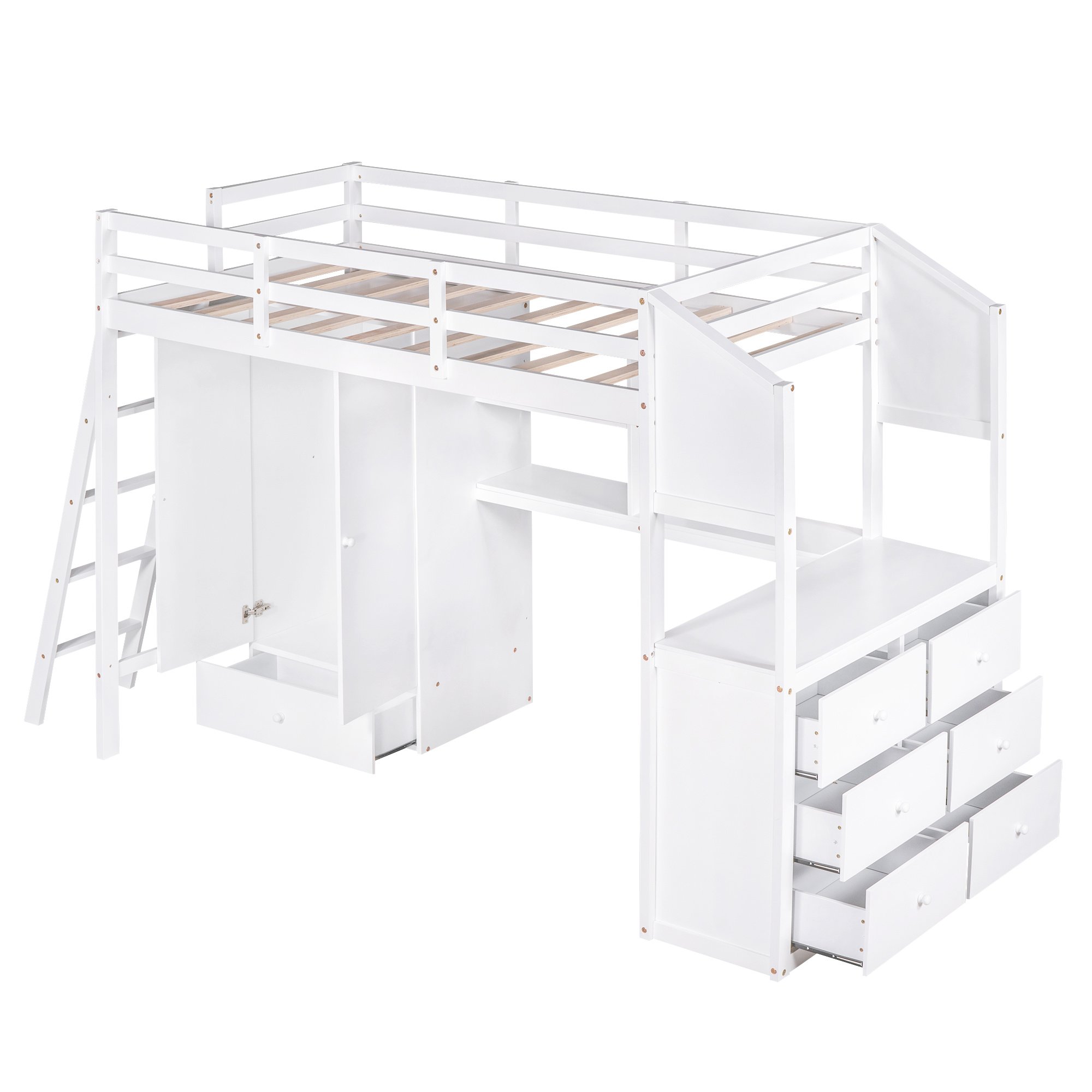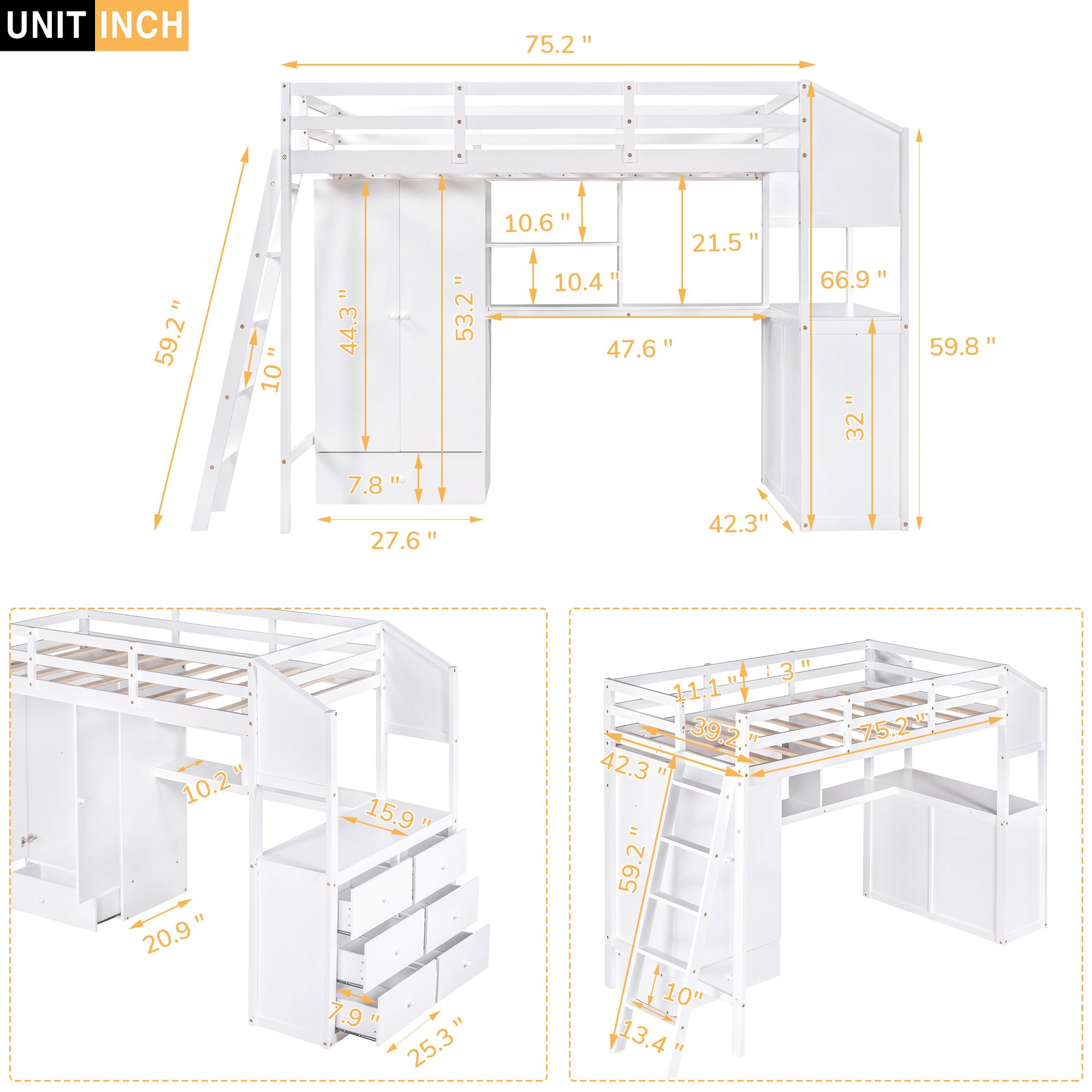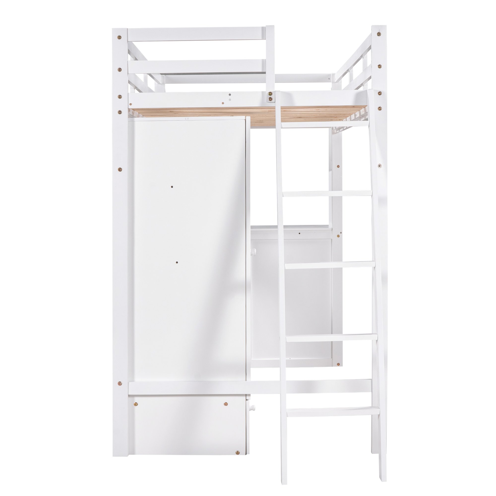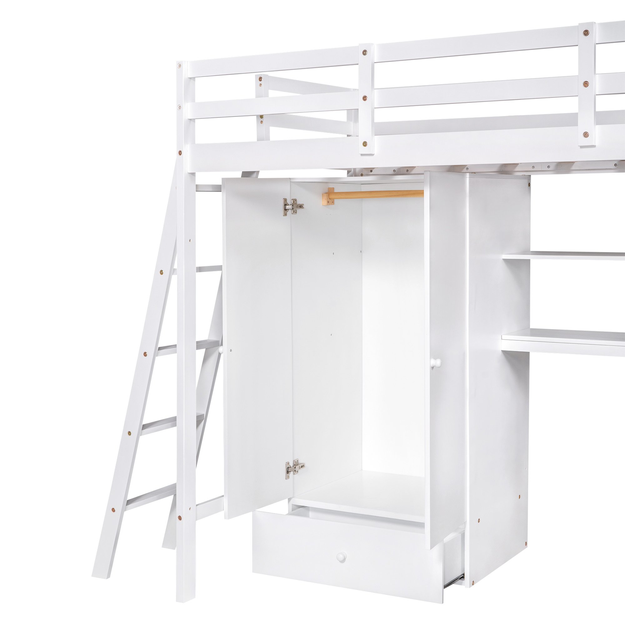 Twin Size Loft Bed with Wardrobe and Drawers; attached Desk with Shelves