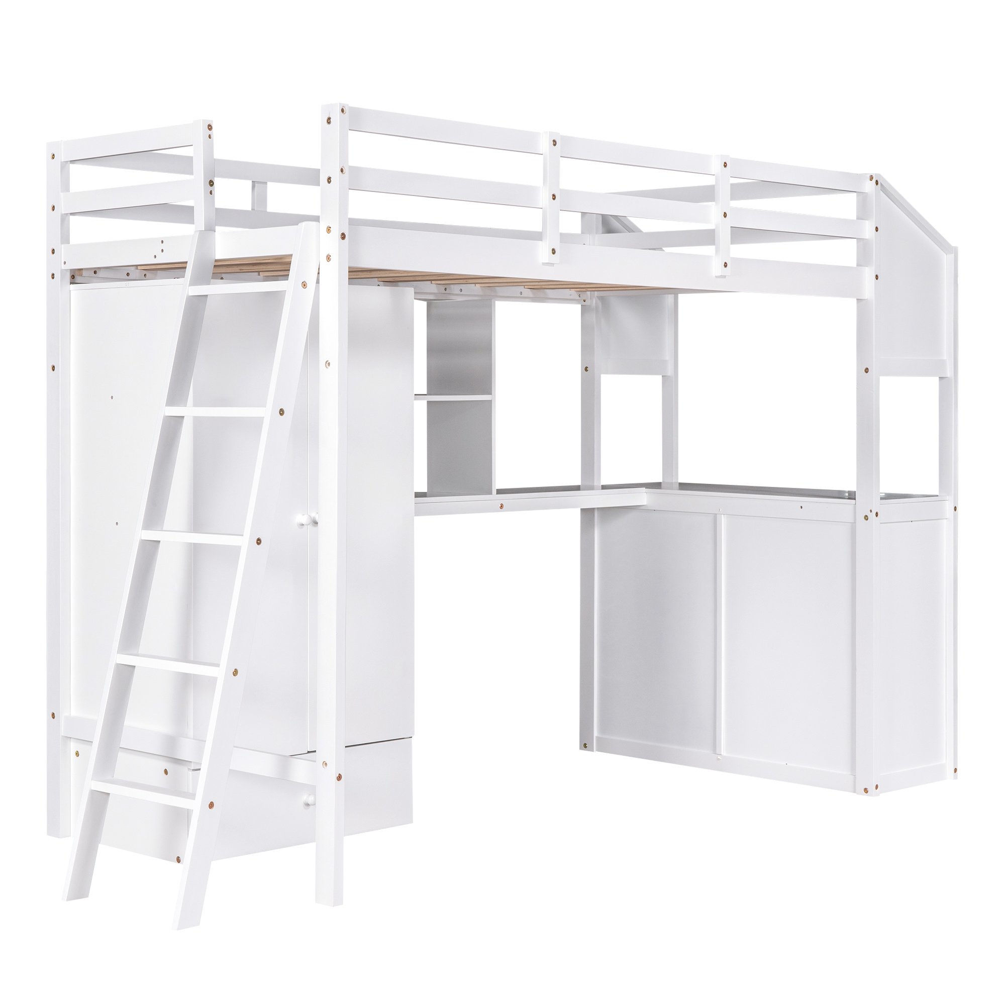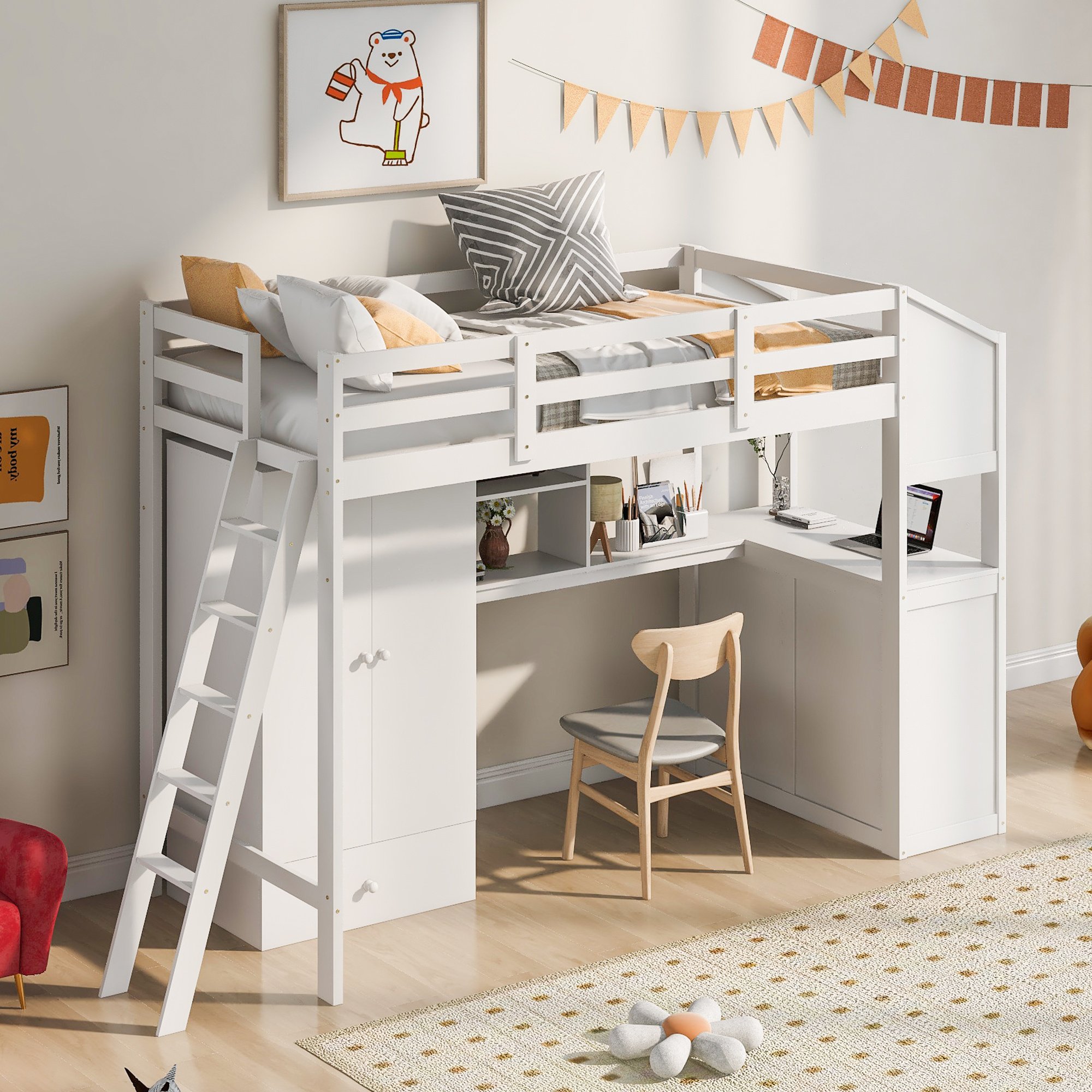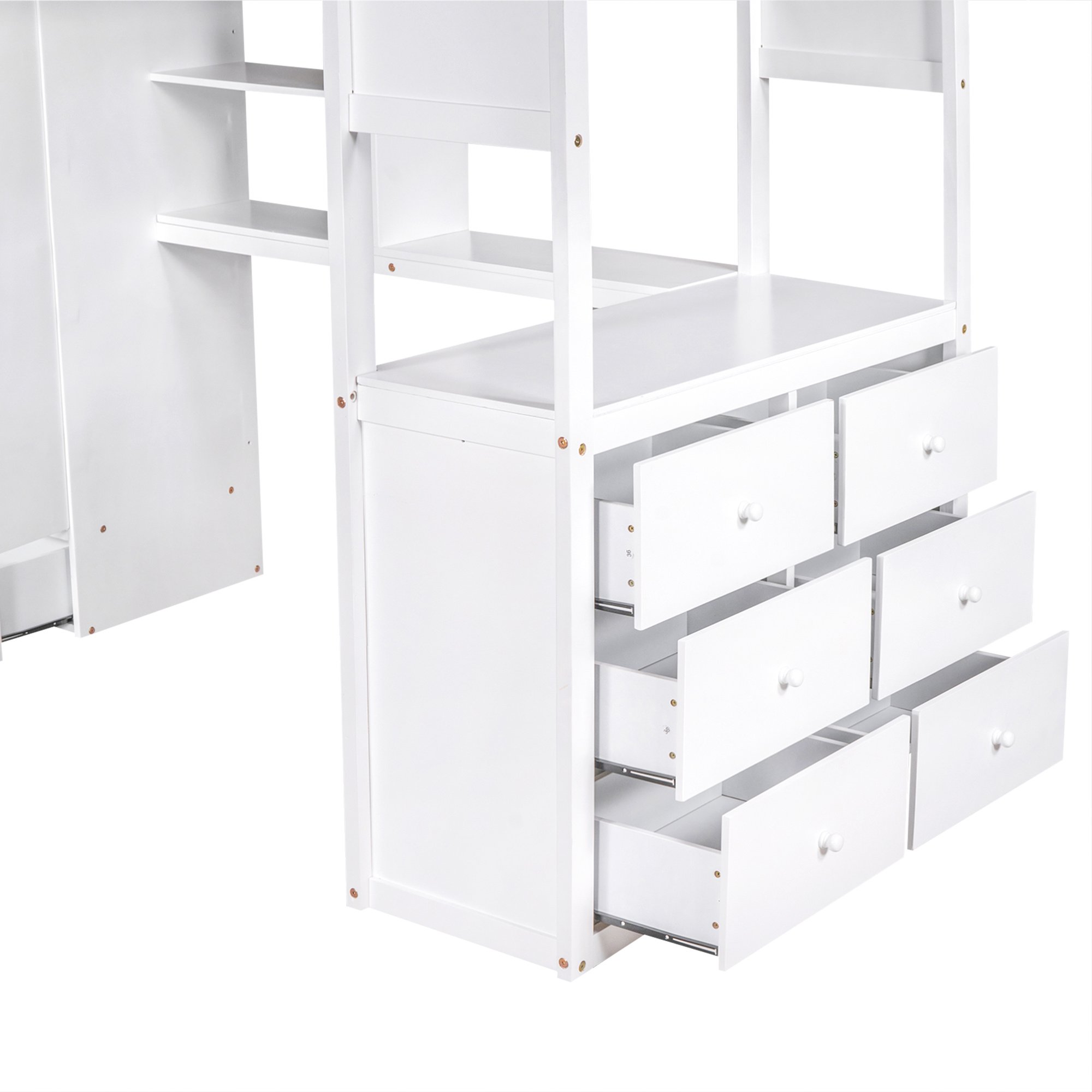 Twin Size Loft Bed with Wardrobe and Drawers; attached Desk with Shelves