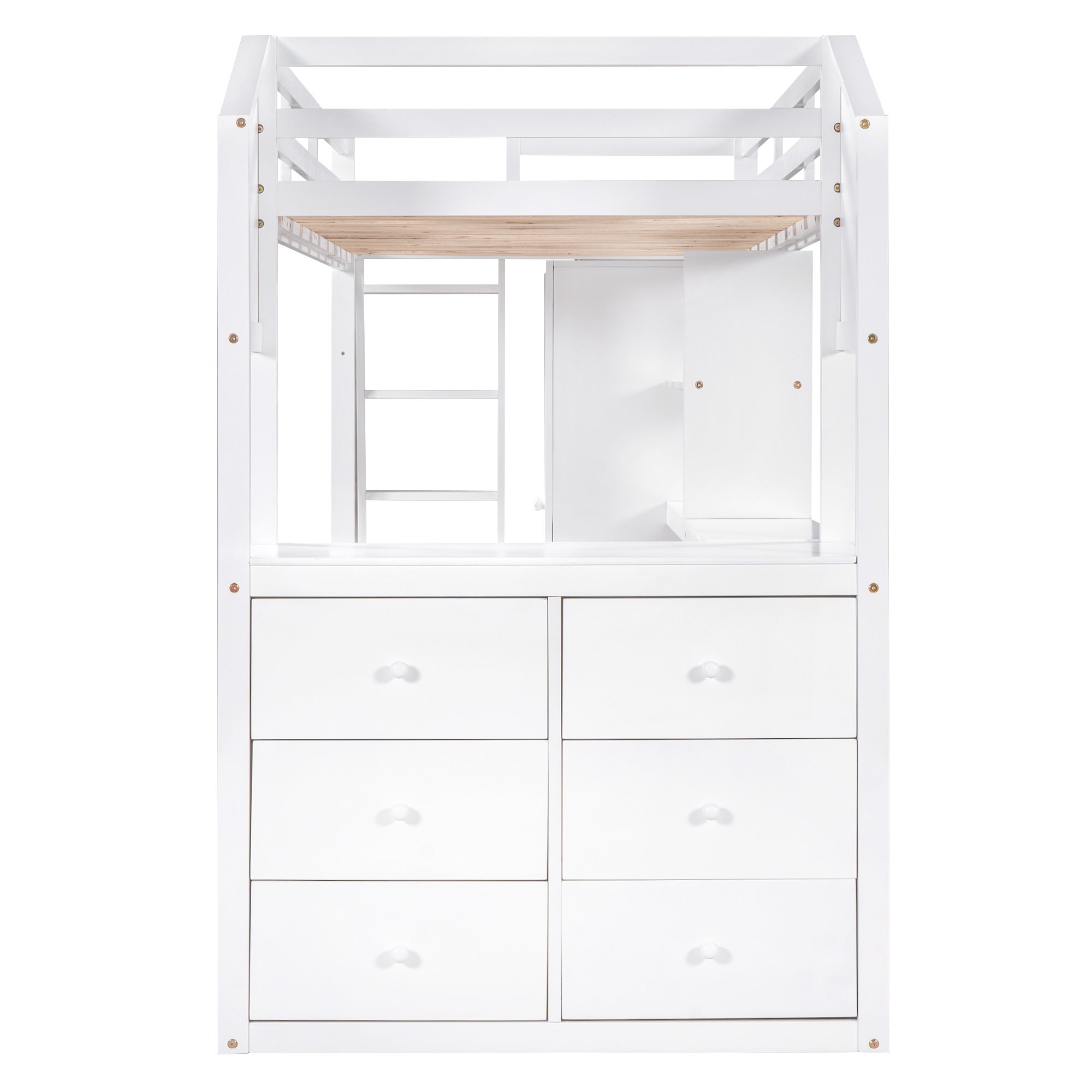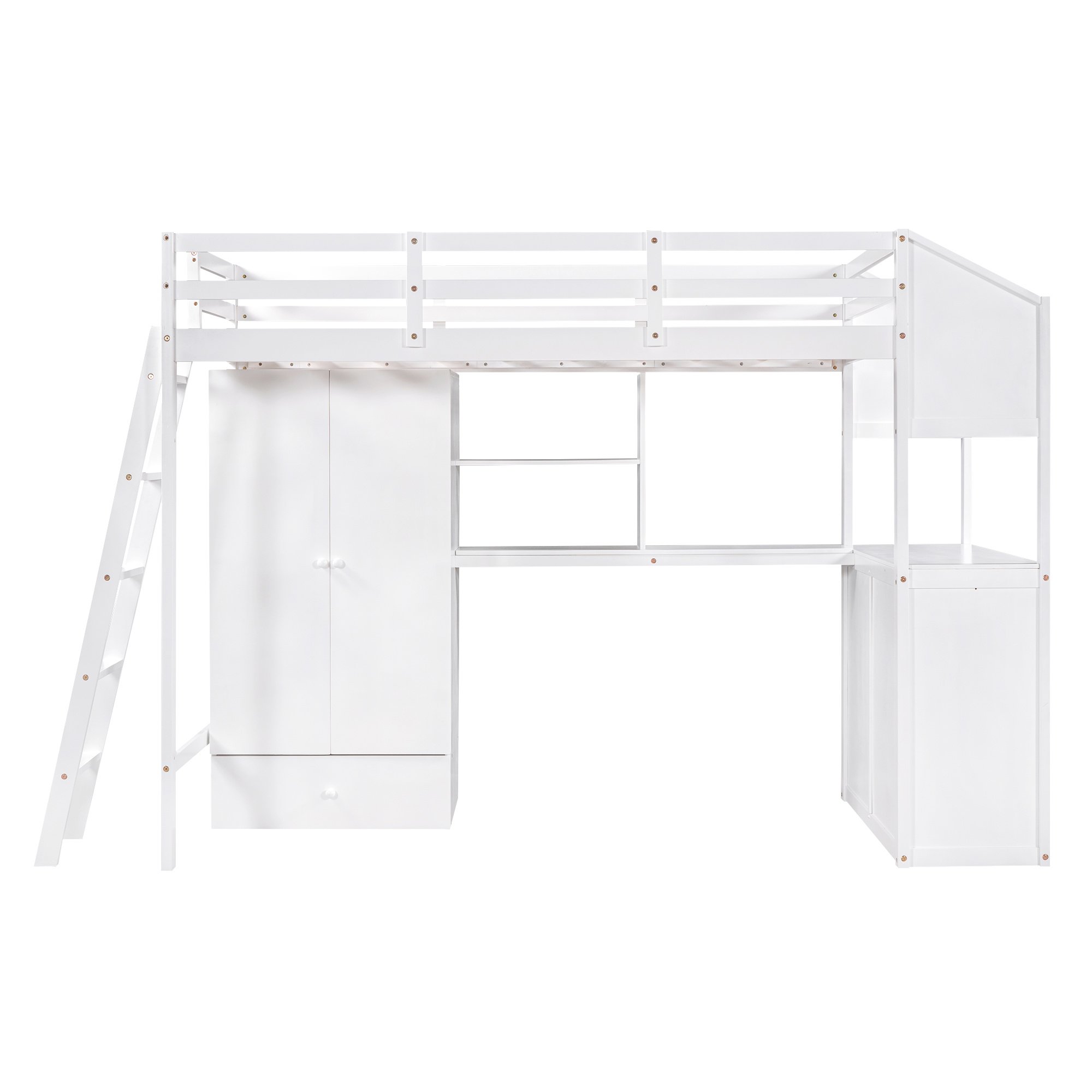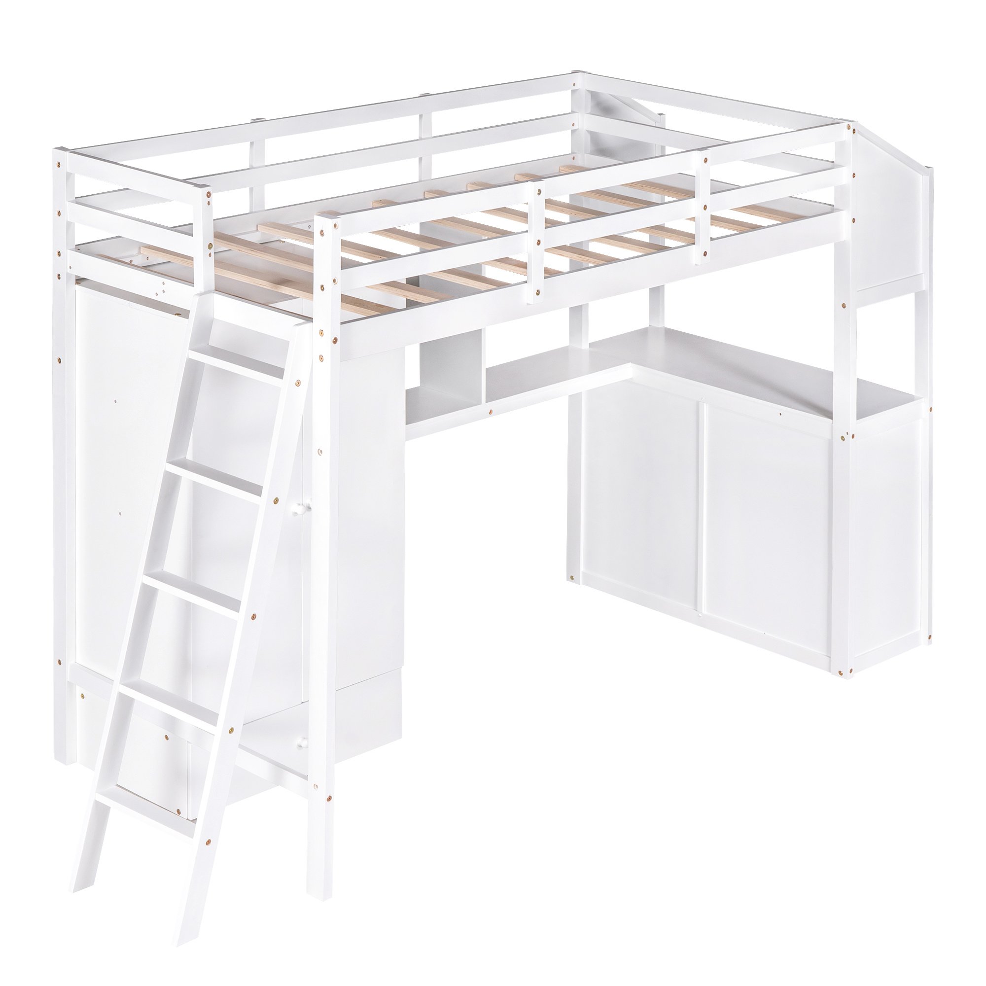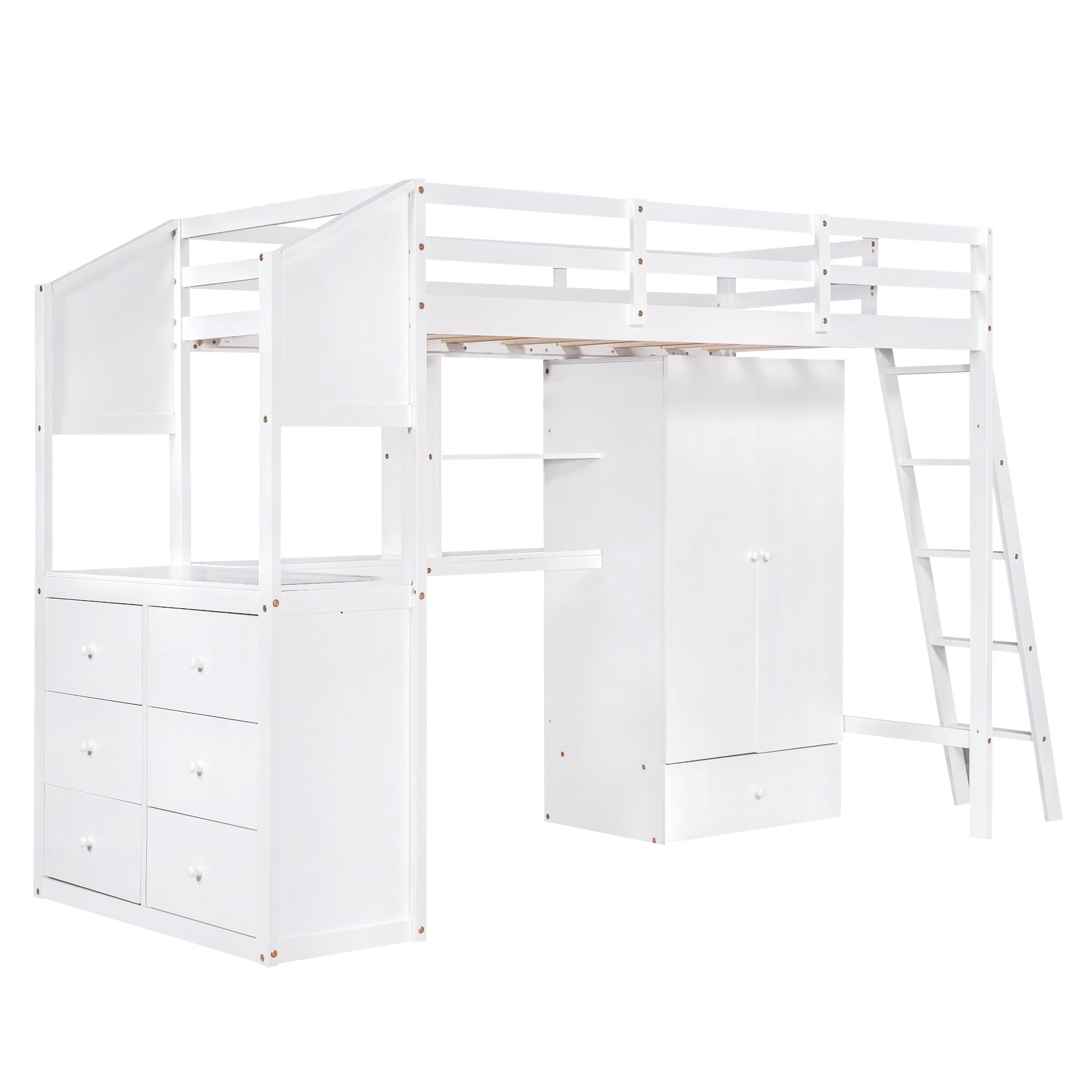 Twin Size Loft Bed with Wardrobe and Drawers; attached Desk with Shelves