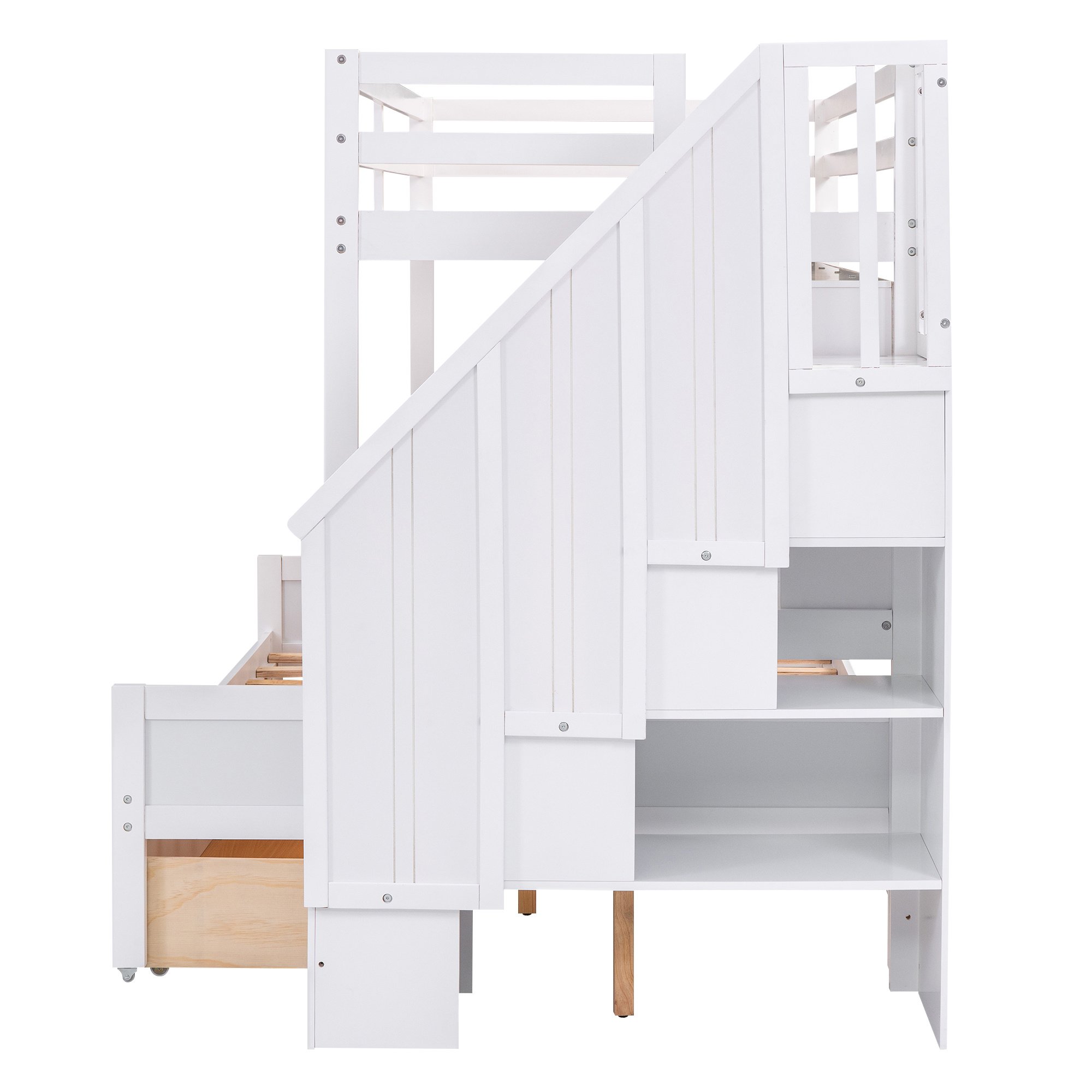 Twin XL over Full Bunk Bed with Built-in Storage Shelves; Drawers and Staircase